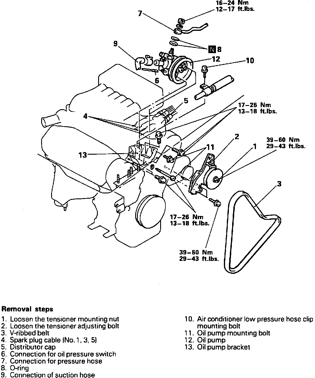 2. Replace power steering pump in numbered sequence shown in Figs. 4 and 5, noting the following: