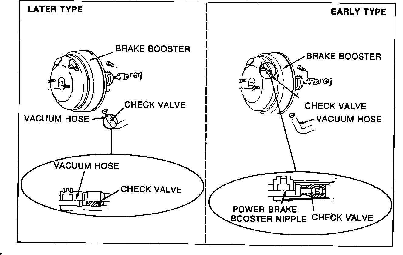 Two types of power brake vacuum check valves are used on 1989 Galant, Mirage, and Sigma vehicles. The difference between these valves is their location in the power brake booster system. Both types maintain a limited vacuum reserve in the power brake booster. The early type valve is in the end of the power brake booster nipple; the later type is located inside the vacuum hose assembly leading from the intake manifold vacuum connector to the power brake booster. This bulletin provides testing procedures for the later type vacuum check valve located inside the power brake booster vacuum hose.