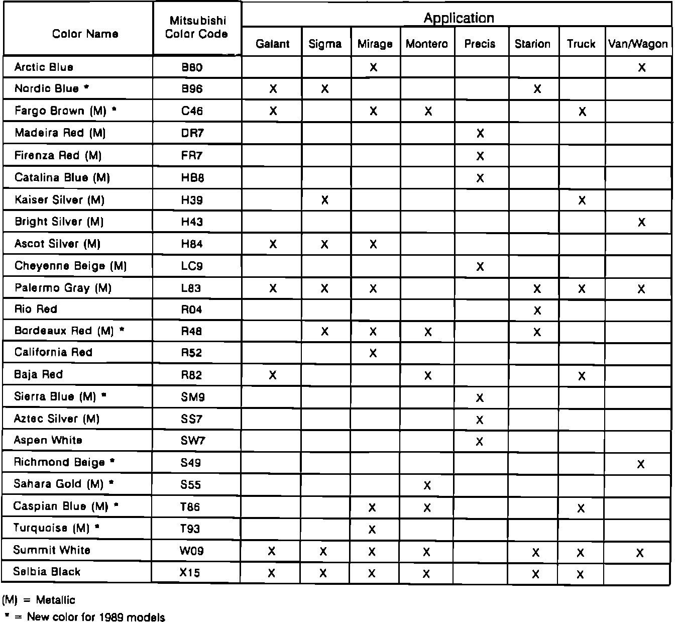 TABLE I: 1989 MITSUBISHI EXTERIOR COLOR CODES AND APPLICATIONS