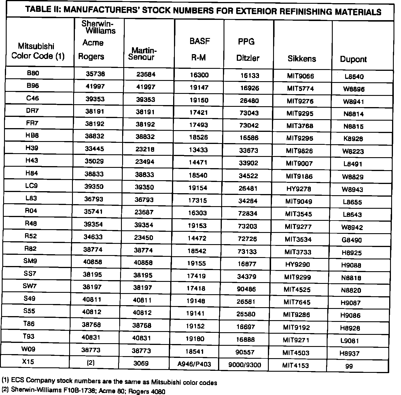 In Table II, are manufacturers' stock numbers which correspond with the Mitsubishi Color Codes shown in Table I.