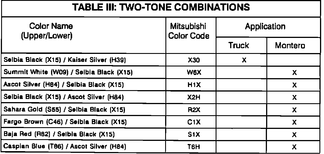 Table III shows the two-tone color combinations for 1989 Mitsubishi models.