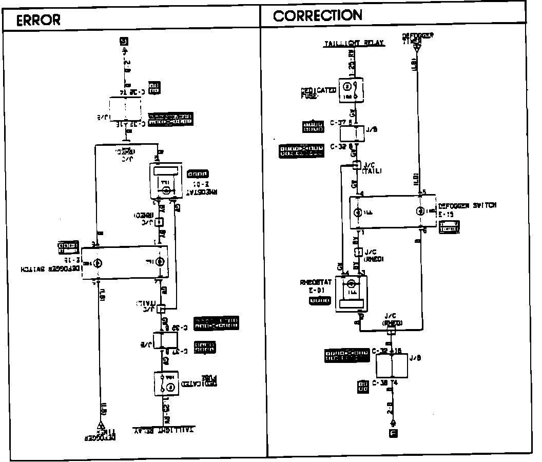 An error occured in the printing of some copies of the 1989 Galant Service Manual. The wiring diagram for the rear window defogger found on page 8-320 of Volume 2 was printed upside down on the page. If the wiring diagram in your Service Manual is printed correctly as shown below, no reference to this bulletin is necessary. If, however, the wiring diagram in your Service Manual is inverted, please write "TSB-89-08-002" in the TSB Revision box at the bottom of page 8-320 in Volume 2 of the 1989 Galant Service Manual.