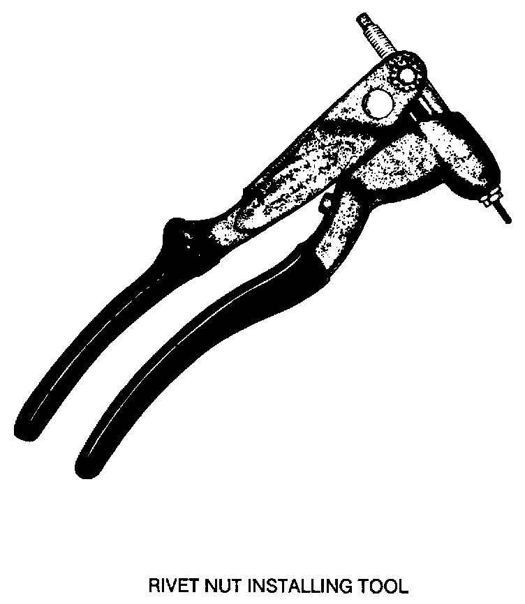 A typical rivet nut tool is shown. They are available usually through your local tool supply house or hardware store, and some automotive tool vendors may also be able to supply you with one. When purchasing or ordering the tool, make sure you get a 10-32 mandrel as well. You have to have the exact mandrel to fit whatever size rivet nut you are using, and the deck rack is supplied with 10-32 rivet nuts. Kits are also available with several mandrels packed with the tool in a storage box.