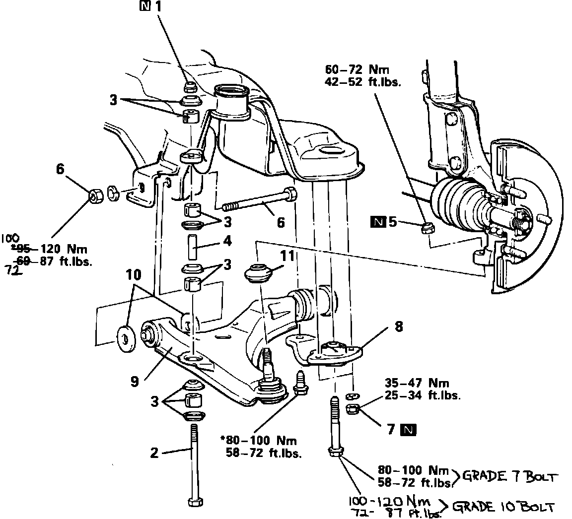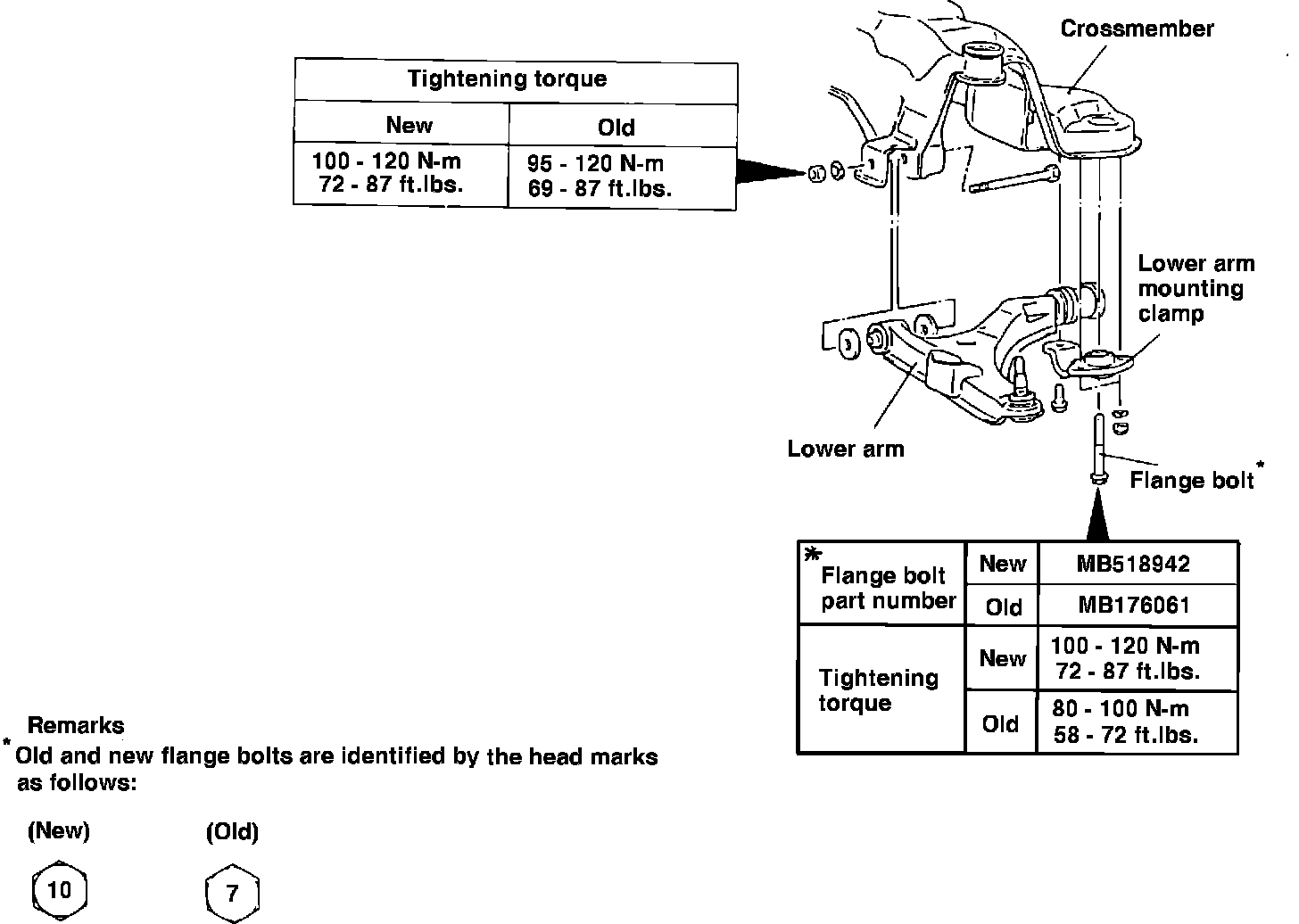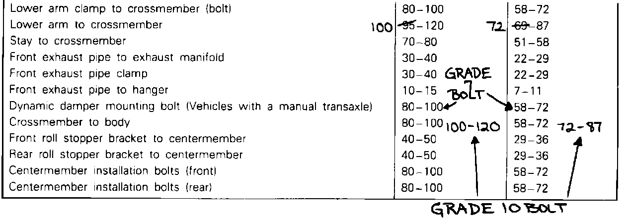 This bulletin describes a change in the torque specification range for the lower suspension arm mounting bolt, and an increase in the torque specification used on the certain flange bolts. Beginning January 1989 the flange bolt was changed from a grade 7 to a grade 10. The grade 10 bolt has a higher torque specification. As a reference to this bulletin, please write the TSB number in the TSB Revision box at the bottom of the affected pages.