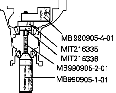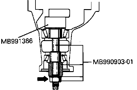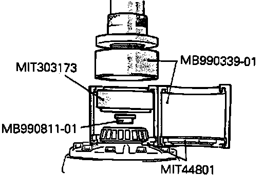 d. Position gauge tube tool No. MB990392-01 or equivalent, in side bearing beat of gear carrier then select a drive pinion rear shim of thickness which corresponds to gap between special tools.