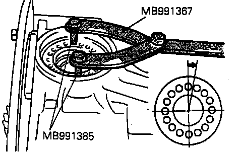 a. Using spanner wrench tool No. MB991367 and pin tool No. MB991385 or equivalent, temporarily tighten side bearing nut until just before preloading.