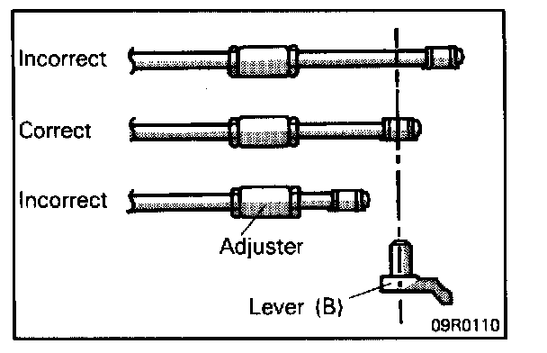 3. Adjust, by using the adjuster, so that the end of the select cable is positioned as shown in the illustration relative to lever (B).