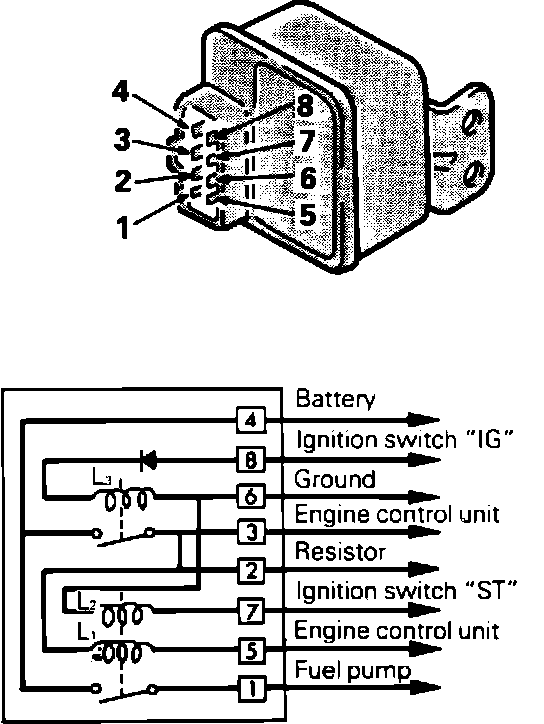The operation of the Fuel Pump is controlled by the ECU through the Control Relay. While cranking, current (supplied by the ignition switch "start" position) flows through coil L2 to close one of the two switches. As a result, the fuel pump is supplied power. Additionally current (supplied by the ignition switch "ignition" position) flows through coil L3 to close the other switch. Power is then supplied to the ECU, Air Flow Sensor (AFS), igniter, injectors and battery power is available to the L1 coil of the S1 switch. After engine start, (power no longer supplied by the ignition switch "start" position) the ECU provides a ground to the L1 coil, allowing the battery supplied current to close switch S1. As a result the fuel pump continues to be supplied power, but is now under the full control of the ECU. In the event of engine stall or other abnormal conditions, the ECU interrupts the ground, opening the L1 coil and interrupting the Fuel Pump power circuit.