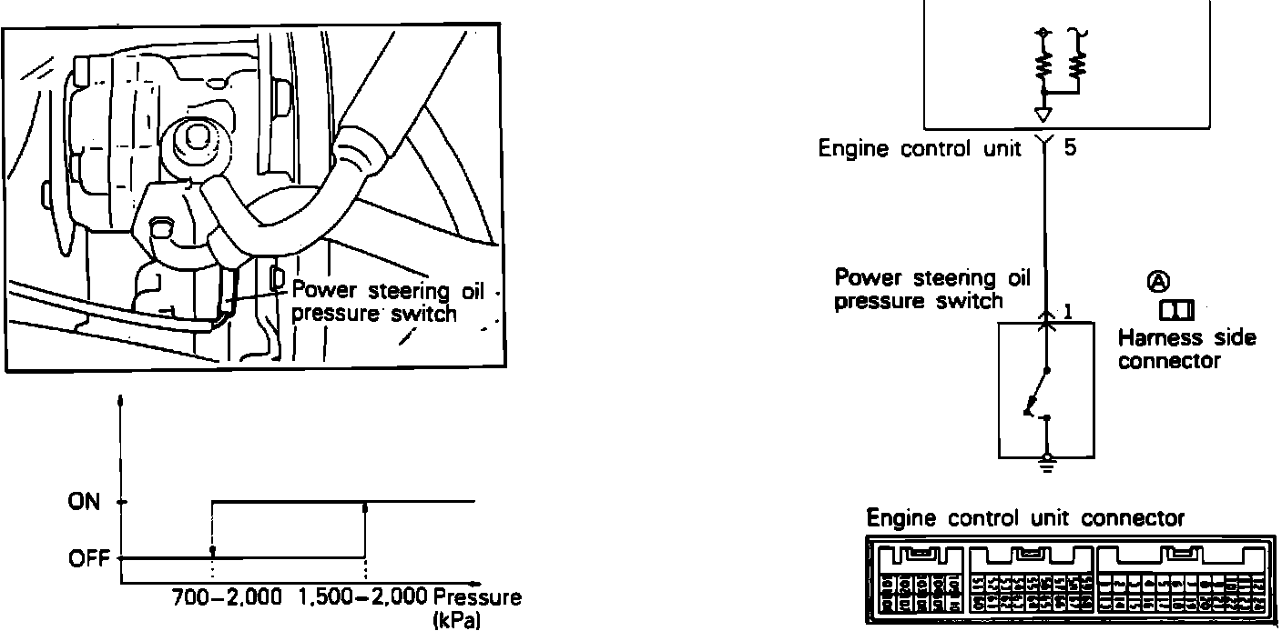 To test the Power Steering Switch, remove the connector and test the terminal for ground with a continuity tester (ohmmeter). With the engine running and the power steering under a load (steering wheel being turned from stop to stop) there should be a ground, with no load (steering wheel centered and stationary) there should be no ground.