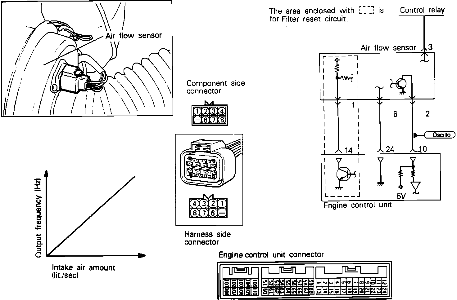 5. Turn off the ignition and disconnect the engine control unit connector. Test for continuity between the engine control unit harness connector terminal 14 and the air flow sensor harness connector terminal 1.