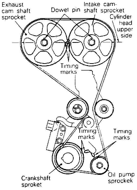 - At this time the timing marks of the camshaft sprocket and the upper surface of the cylinder head should coincide, and the dowel pin of the camshaft sprocket should be at the upper side.