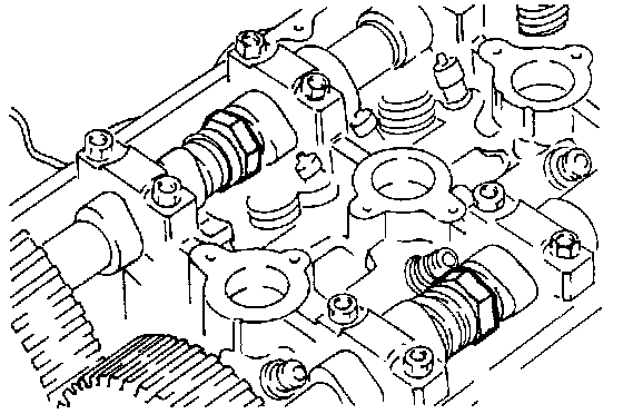 (1) Using a wrench, hold the camshaft at its hexagon (between the No. 2 and No. 3 journals) and remove the camshaft sprocket bolt.