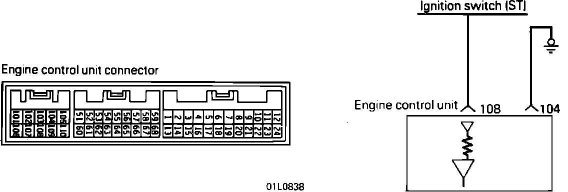2. Using a voltmeter, measure the power input voltage, between the ECU harness connector terminal 108 and ground.