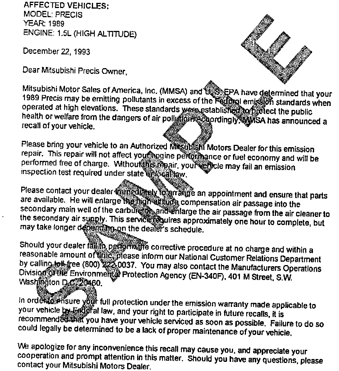 This bulletin provides a detailed procedure for modifying the emission control system on certain 1989 Federal Emission Certified Precis vehicles located in 21 western states. This modification reduces the amount of Carbon Monoxide (CO) gases emitted from the vehicle in high altitude conditions. A letter has been sent to all owners of the affected vehicles informing them to return their vehicles to their Mitsubishi Motors dealer to have the emissions system serviced. A copy of this letter is shown in this bulletin.