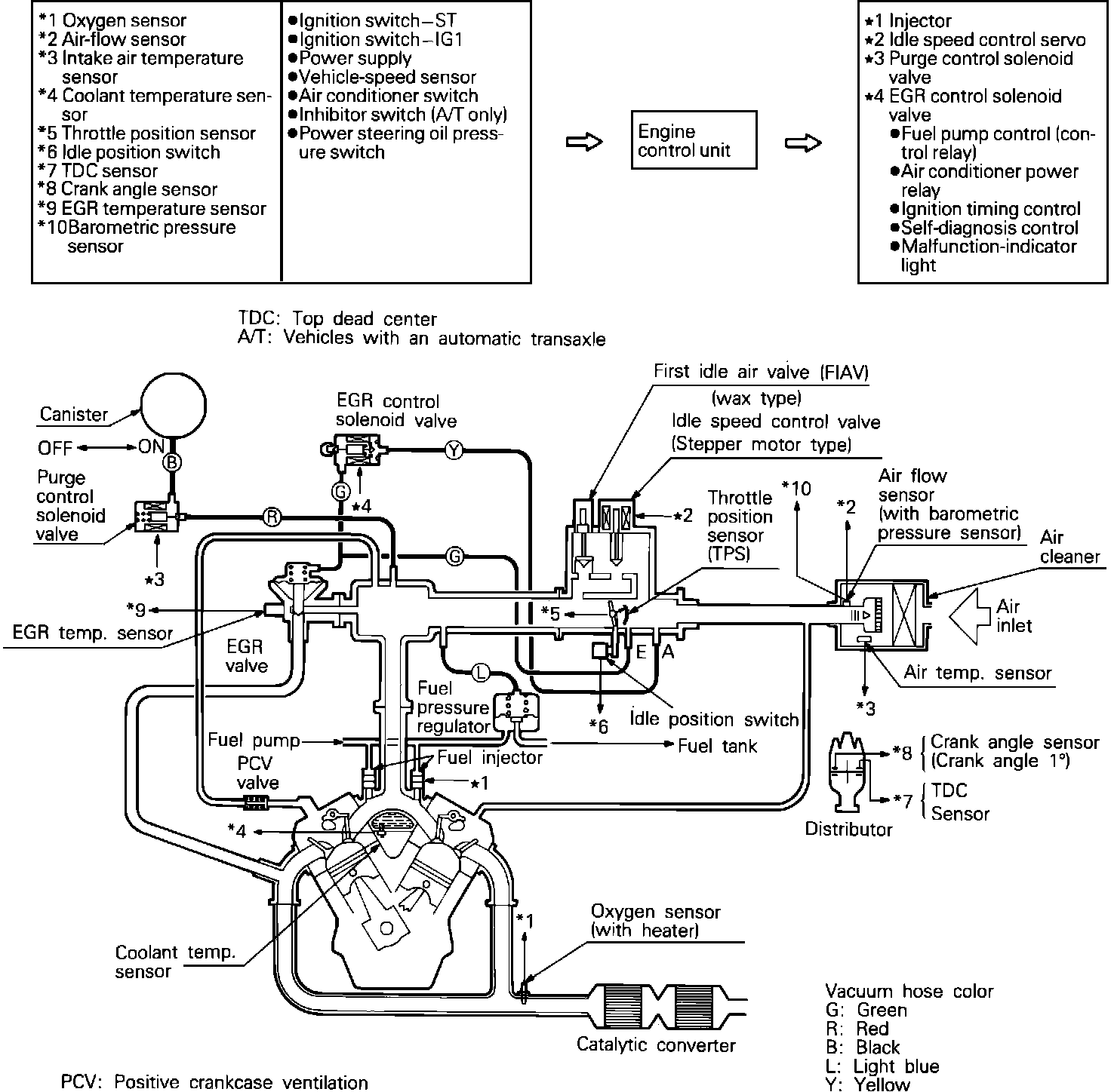 Based on the information from the input sensors, the ECU determines the optimum control for the operating conditions and drives the output actuators accordingly. The ECU consists of an 8-bit microprocessor, random access memory (RAM), read only memory (ROM) and Input/Output (I/0) interface. The ECU actively controls the operation of the Fuel Injection system, the Ignition timing and has full control of the Idle Speed Control system. Additionally, the ECU interrupts the operation of the Air Conditioning and EGR systems under some conditions and controls the power to the Fuel Pump. Each of these systems is covered in detail in COMPONENT OPERATION along with the input sensors used to supply the operating conditions to the ECU.