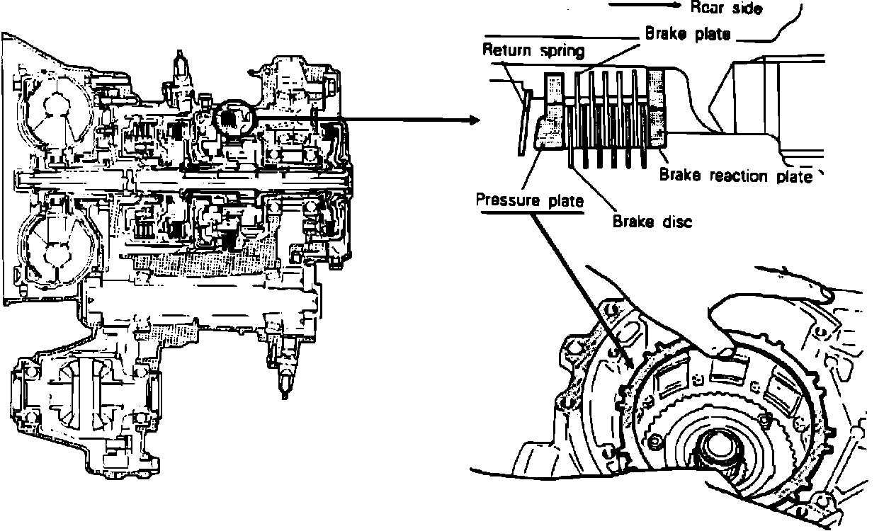 On KM175-5 and KM177 equipped vehicles built after 9/19/88, use the new specification during repairs. Also use the new specification if you are overhauling the low/reverse brake assembly on a KM175-5 or KM177-equipped vehicle built before 9/19/88. To assist you in achieving this decreased value, two new thicker pressure plates are available.