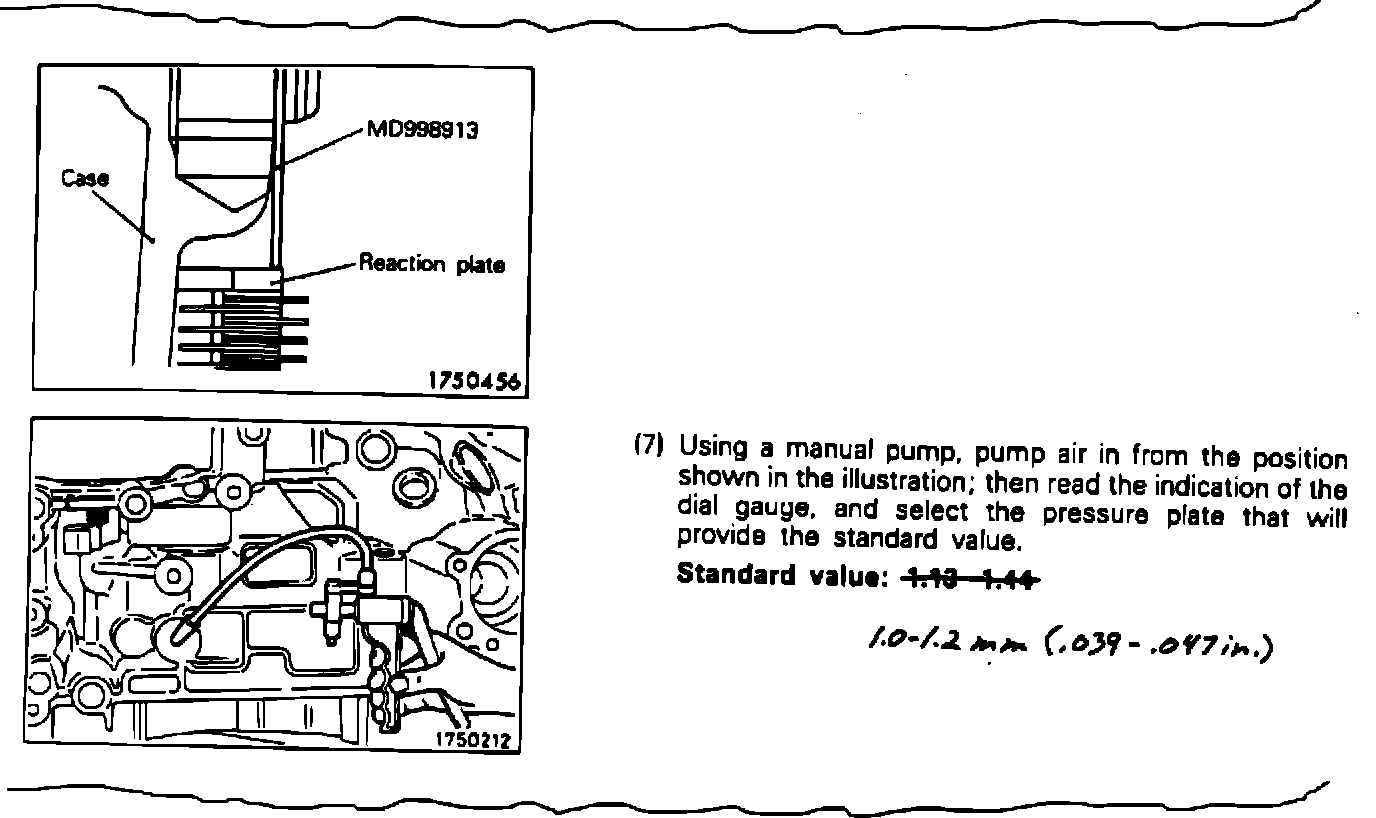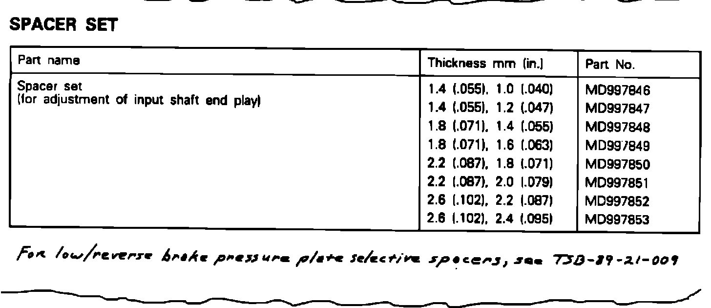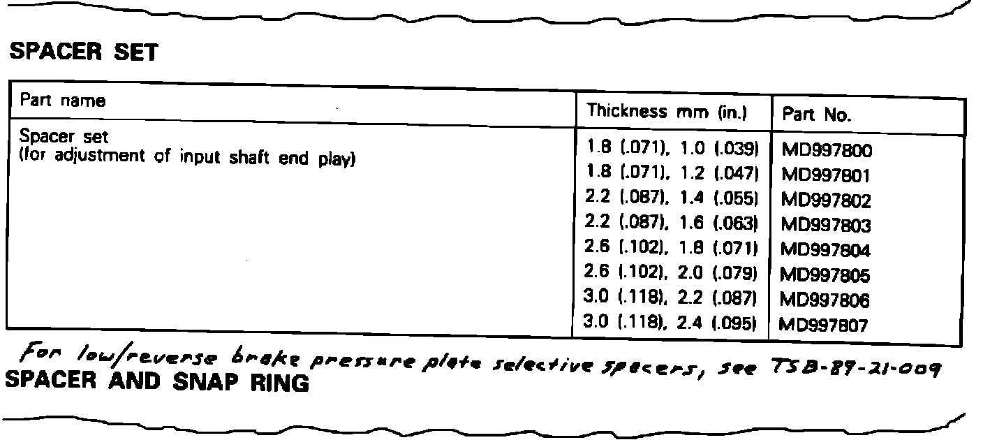 On 1989 Galant and 1989 Sigma V6 built prior to the production change, use the new value if you are already repairing the low/reverse brake. To assist in doing this, two thicker selective pressure plates are available. Depending on your measurements, use the appropriate one to attain the correct end play.