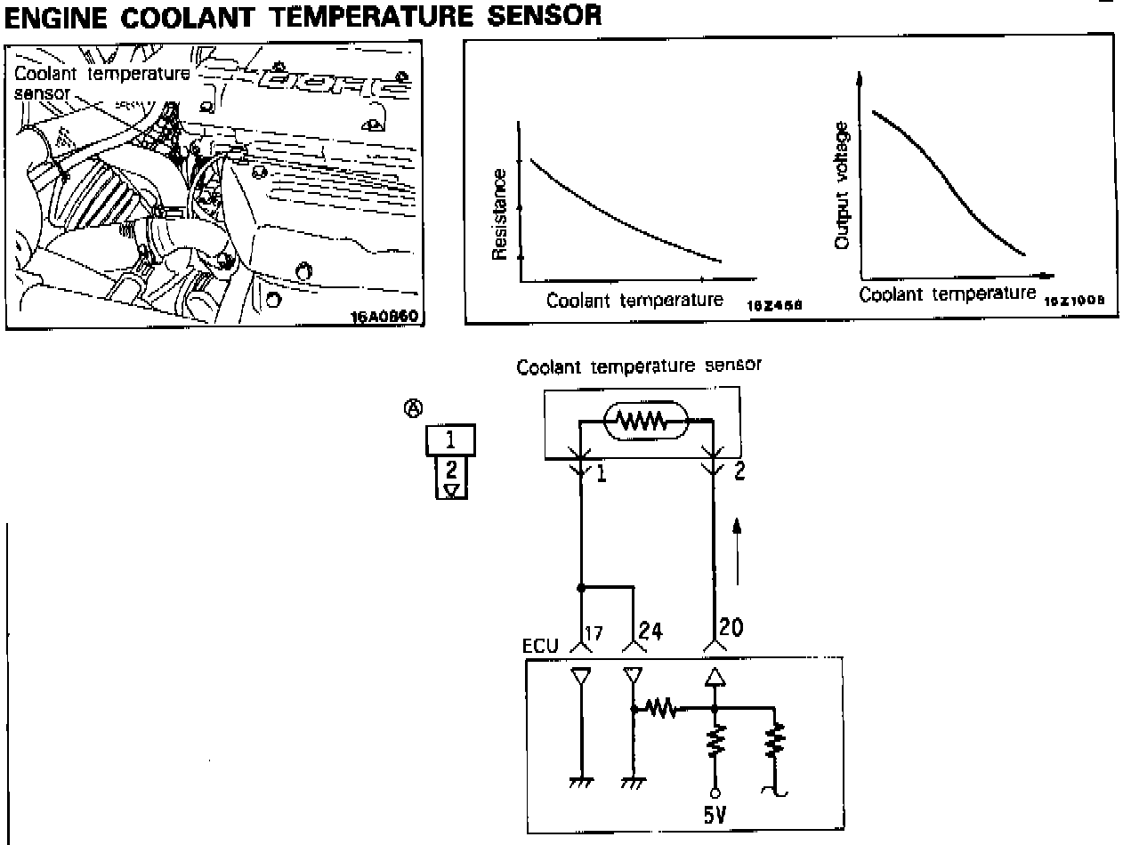 The engine coolant temperature sensor is provided on the thermostat case, being one type of the resistor which detects the engine coolant temperature.