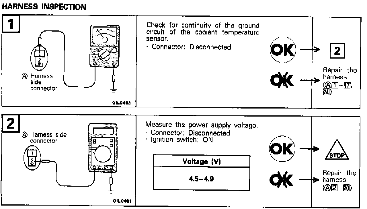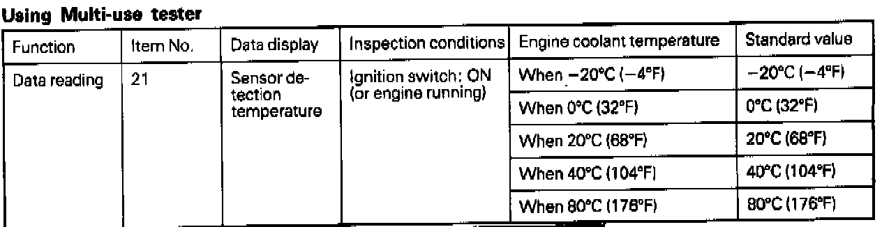 When it is troubled, the engine coolant temperature is regarded as 80°C (176°F) for control. Engine starting may be defective. driveability may become poor and idling may be unstable at the cold time or in the winter. The trouble can hardly be felt when the engine coolant is warmed up.