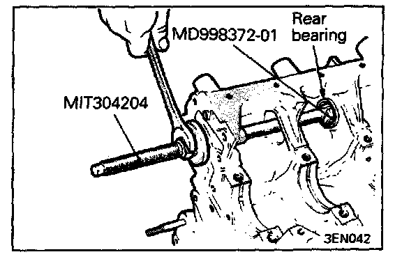 2. Using special tools, install right rear bearing. Make sure that oil hole of bearing is aligned with oil hole of cylinder block.
