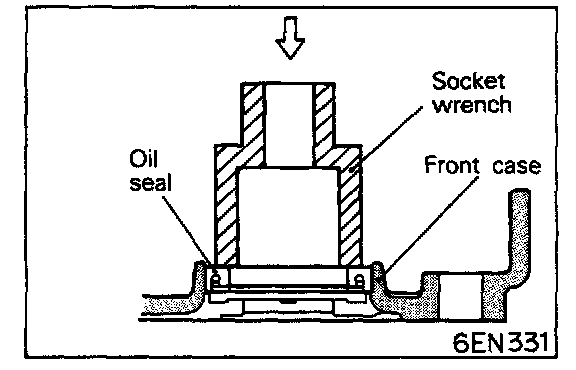 Using a socket wrench, press-in the oil seal into front case.