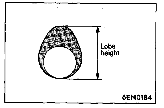 2. Check cams for excessive wear and damage and replace if defects are evident. Measure the lobe height and replace if the limit is not reached.