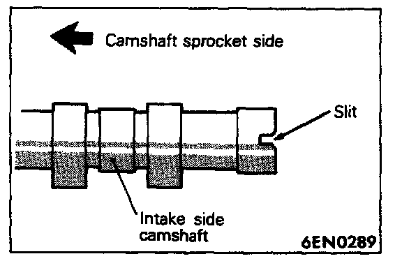 2. Install the camshafts on the cylinder head. Use care not to confuse the intake camshaft with the exhaust one. The intake camshaft has a slit on its rear end for driving the crank angle sensor.