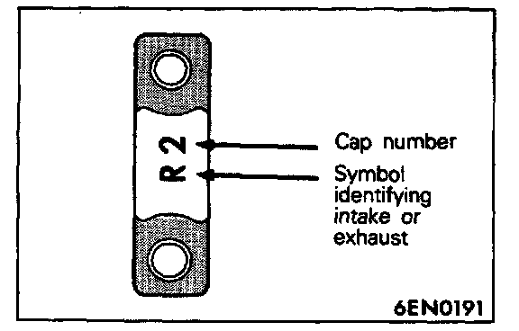 1. Bearing cap Nos.2 to 5 are of the same shape. At installation, check with the markings on the caps of cap number and intake/exhaust identification symbol. Only "L" or "R" is stamped on No.1 bearing cap.
