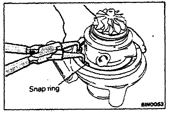 Place the compressor cover assembly on the floor with its end surface down and remove the snap ring with pliers.