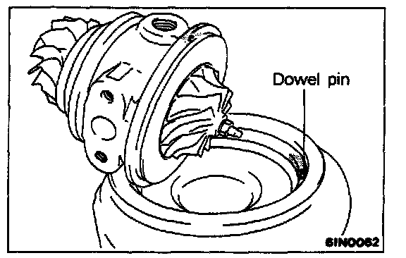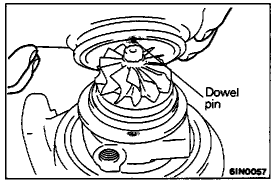 Install the compressor cover and cartridge assembly on the turbine housing with the dowel pin in alignment