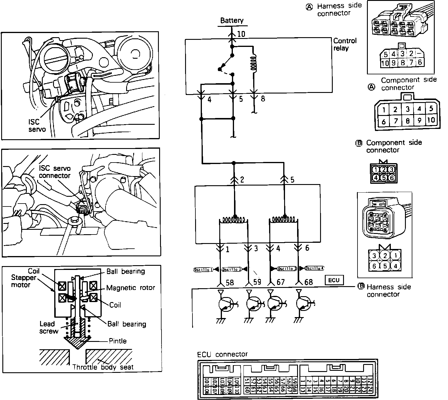 The ISC servo is a stepper motor that regulates the amount of air taken in through the bypass circuit of the intake manifold by opening and closing the servo valve located in the air passage. The ECU will supply Voltage in one polarity direction, which will turn the motor in a particular rotation. Connected to this motor's shaft is a screw that when turned, either opens the passage or closes the passage (depending upon rotation) by moving the pintle. When the ECU reverses polarity, the passage is closed in the same manner.