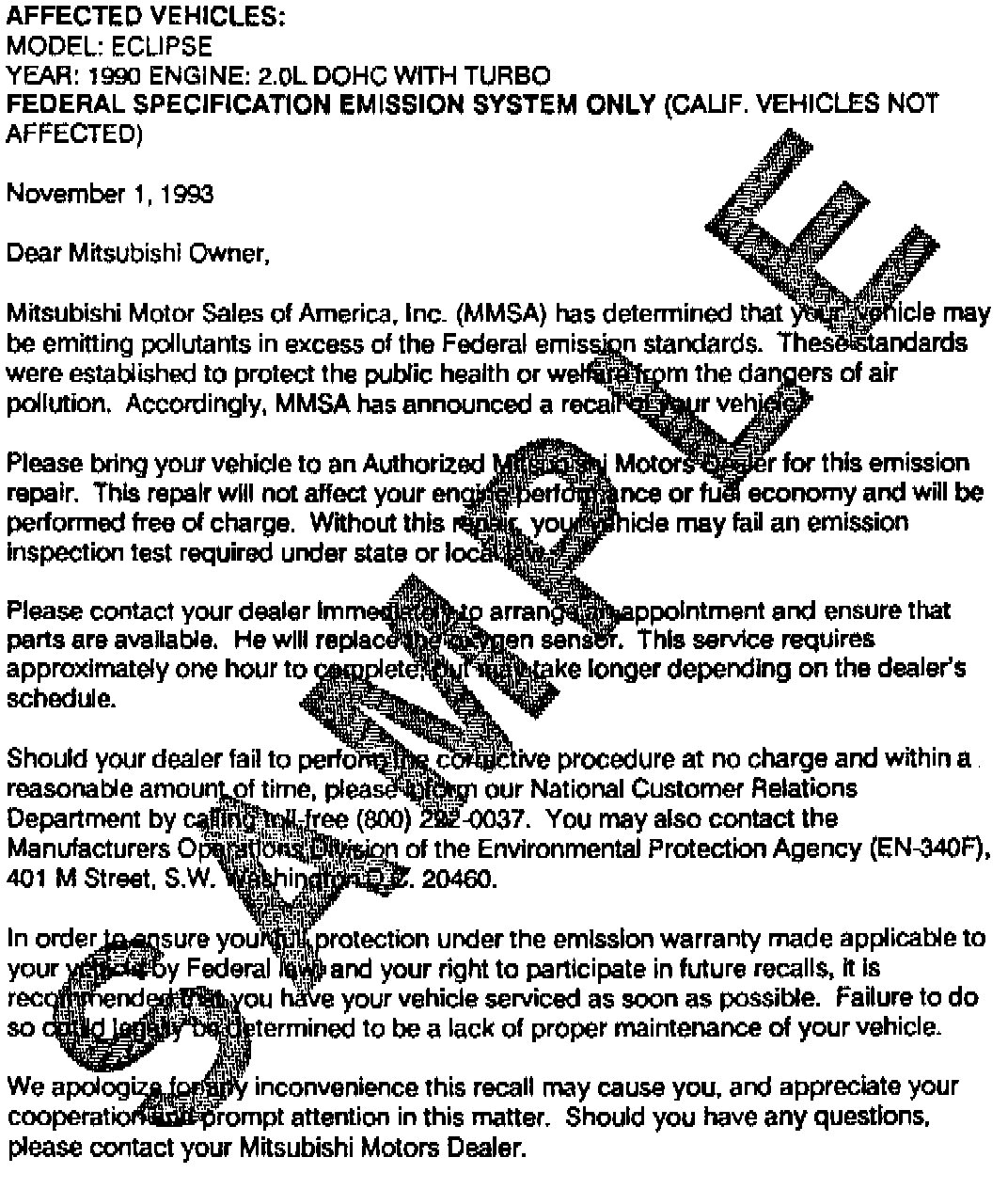 PurposeThis bulletin provides a detailed procedure for inspection and repair of the emission control system on certain 1990 2.OL turbocharged Federal Emission Certified Eclipse FWD and AWD models. A letter has been sent to all owners of the affected vehicles informing them to return their vehicles to their Mitsubishi Motors dealer to have the engine serviced. A copy of this letter is shown in this bulletin.