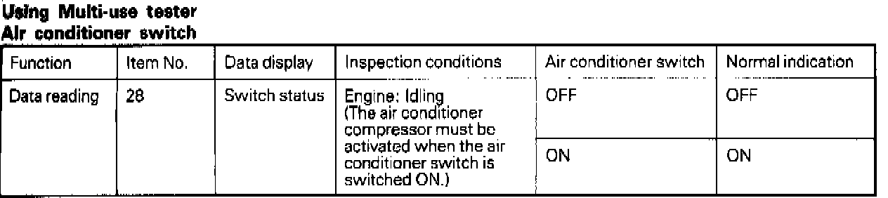 When idling speed does not increase for the air conditioner or when the air conditioner compressor does not run, a short-circuit or broken wire may occur in the circuit related to the air conditioner.