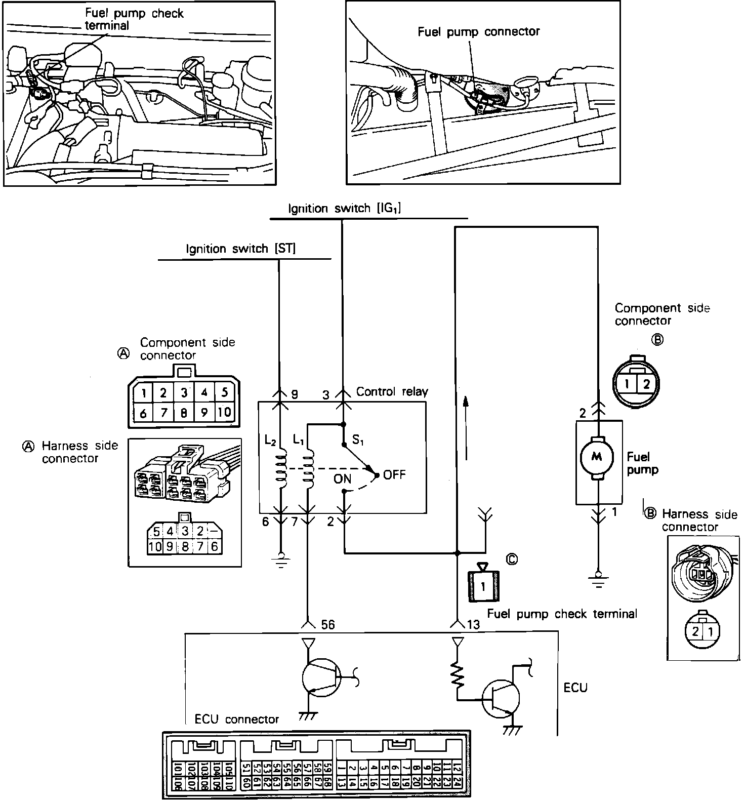 3. Disconnect the ECU connector and the control relay connector. Using an Ohmmeter, check for continuity between the ECU harness connector terminal 13 and the control relay harness connector terminal 2.