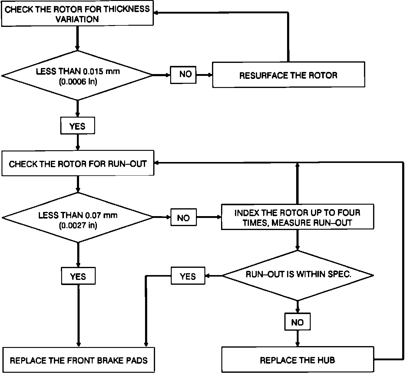 2. If run-old is not within specs, index the rotor (change its phase on the hub) until run-out is within specs. This part of the procedure is described in more detail later.