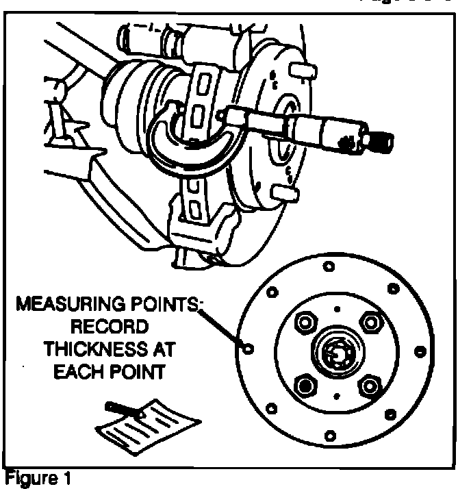 Measure rotor thickness at 8 or more points. See Figure 1. Record each thickness reading. Compare the largest to the smallest. The difference (largest - smallest) must be less than 0.015 mm (0.0006 in).