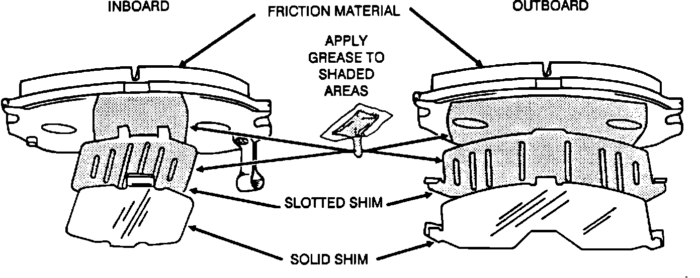 Do not allow any brake grease to contact the friction material. If the friction material becomes contaminated with the brake grease, discard the pad.