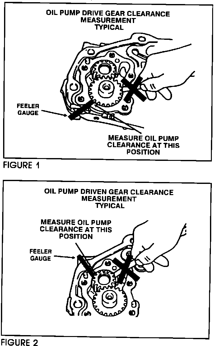 In order to increase service accuracy, the oil pump gear tip measurement position has been moved. Shown in figures 1 and 2 the correct places to measure the clearance on both the drive gear and the driven gear. Please make the indicated changes to the service manuals listed below and write this TSB number in the TSB revision boxes on the affected pages. Clearance specifications have not changed. Please refer to the Service Manual for clearance specifications.