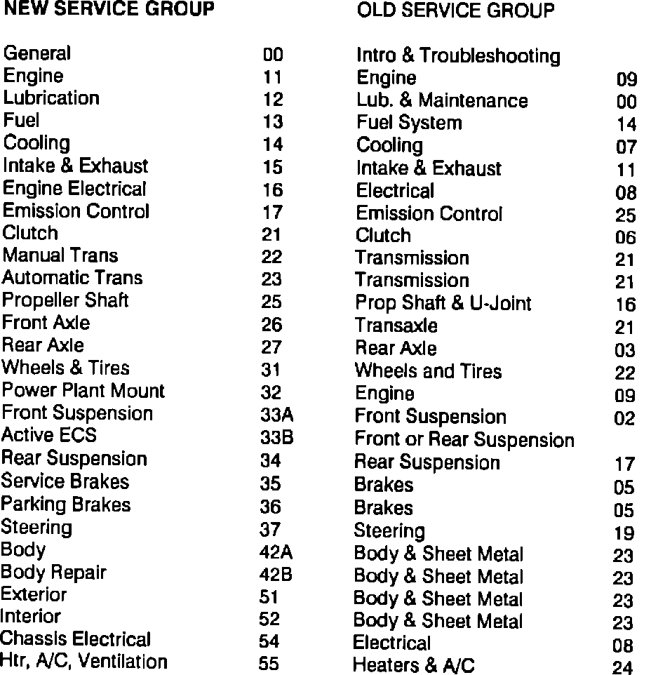 As of June 1, the numbering of Technical Service Bulletin service groups has changed. TSBs published from June 1989 forward will conform to the new service group numbering shown below. The new Dealer Service Information Binder has tabs that correspond to the new service groups. TSBs published January - May 1989 should be filed in the 1989 TSB Binder. TSBs published June 1989 forward should be filed in the Dealer Service Information Binder.