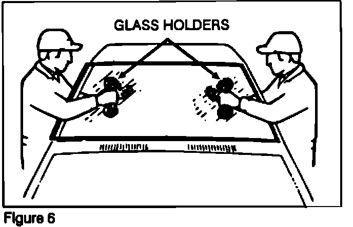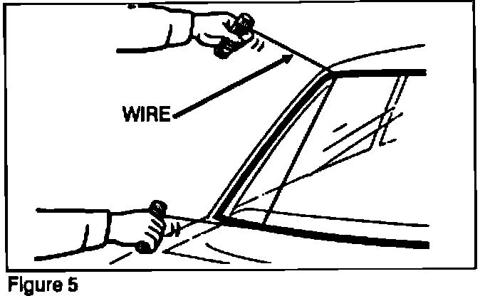 Secure each end of the wire to a piece of wood or similar object. Carefully cut through the adhesive by pulling the wire along the windshield from outside the vehicle in a sawing motion (Figure 5).