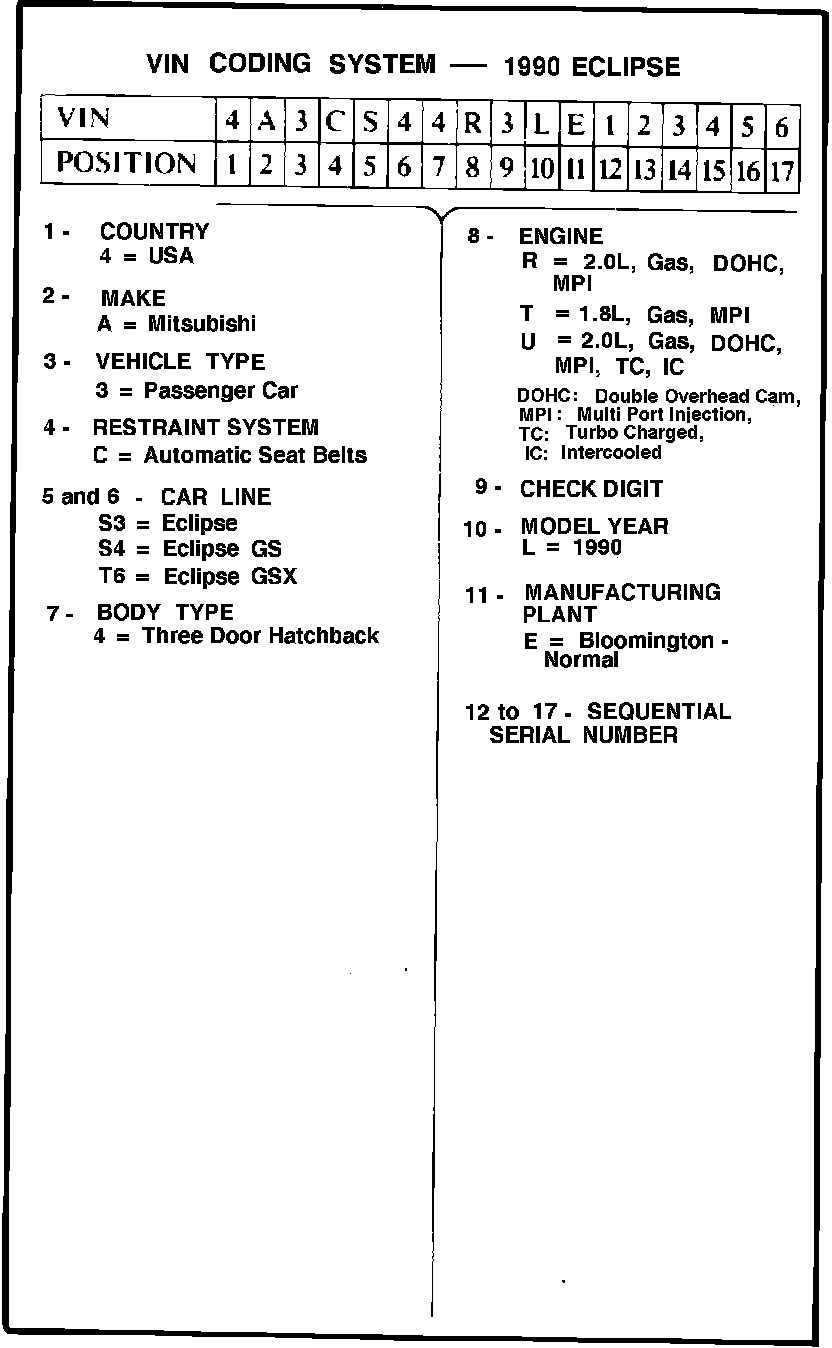 This bulletin contains additional information to decode the Vehicle Identification Number on the 1990 Eclipse GSX. As additional 1990 models are released, they will be covered in future technical bulletins.