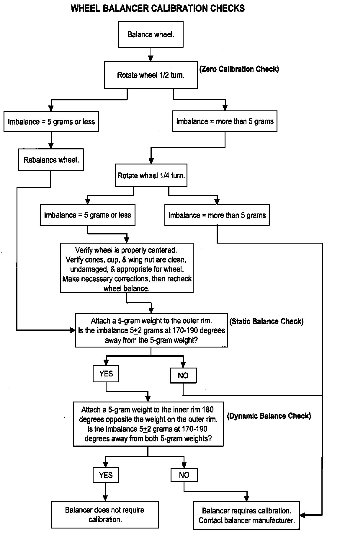 Check your balancer's calibration approximately every 100 balances. Your wheel balancer's instruction manual should include calibration procedures. It the calibration procedures specifically for your balancer are missing, use the generic steps in this bulletin for zero calibration, static balance, and dynamic balance checks. The wheel balancer calibration checks are also described in the flowchart in this bulletin.