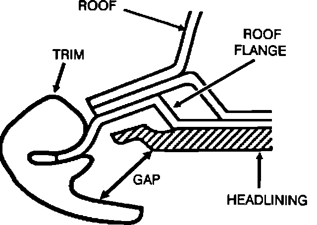 4. Push the trim up and work it onto the roof flange. As you install the trim onto the flange, position it so there is a gap between the edge of the trim and the headlining (See Figure 5).