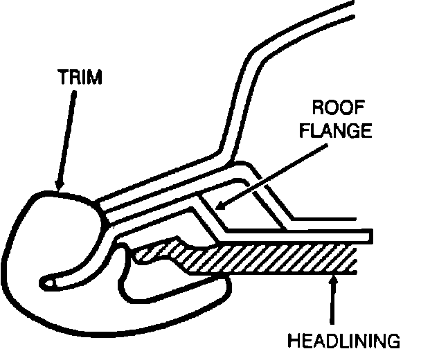 3. Push the end of the new headlining trim into place on the 20 section (Figure 3) of the roof flange shown in Figure 4. Hold the remaining length of the trim at a 90 degree angle to the roof flange and hold it against the windshield.