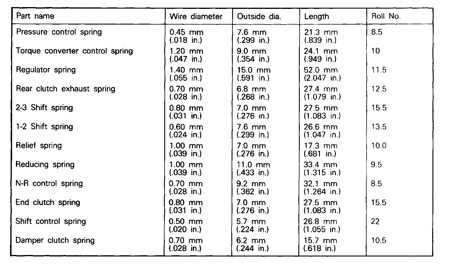 Valve Body Spring Identification Table