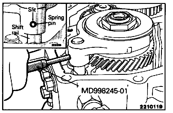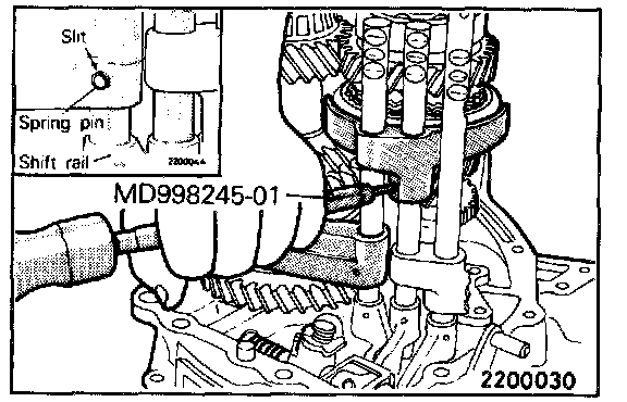 Using the special tool, drive the spring pins into position. Make sure that the slit in the spring pin is aligned with the shift rail centerline.