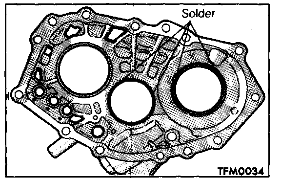 1. Place two pieces of approximately 10 mm (.39 in.) long; 3 mm (.12 in.) dia. solder at the locations shown on the transaxle case and install each outer race.