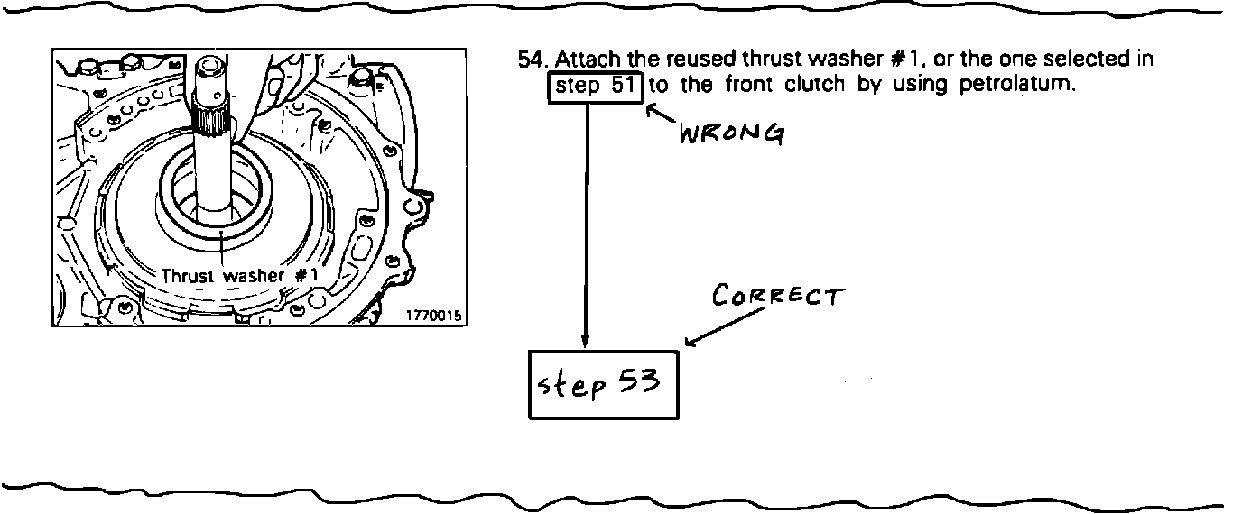 In one of the re-assembly steps of the Automatic Transmission, the service manual shows the wrong step callout. This bulletin describes the correction. As reference to this bulletin, please write the TSB number in the TSB revision box at the bottom of affected page.
