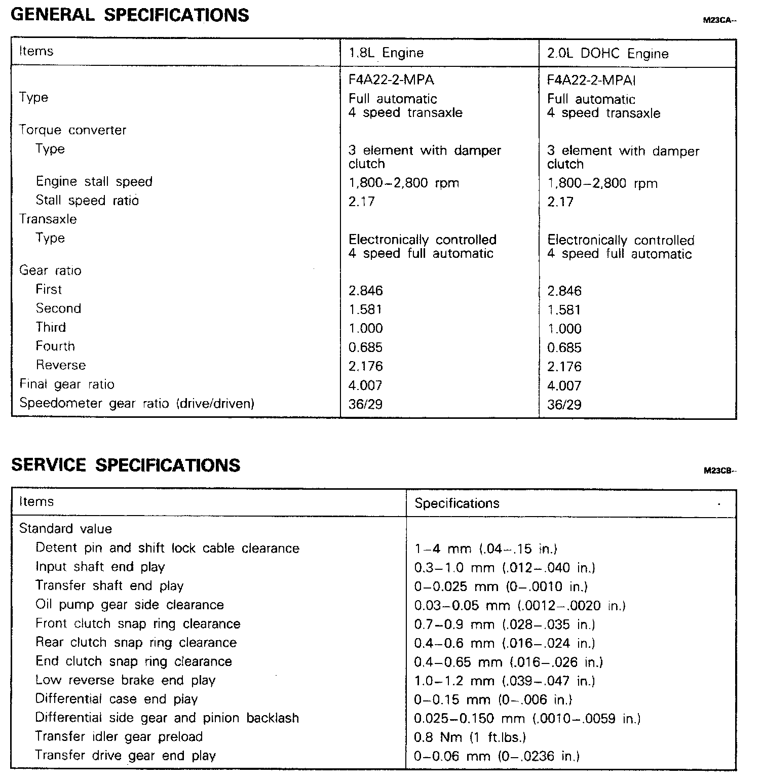 F4A22 4-spd A/T, Gear Ratios & Standard Values: