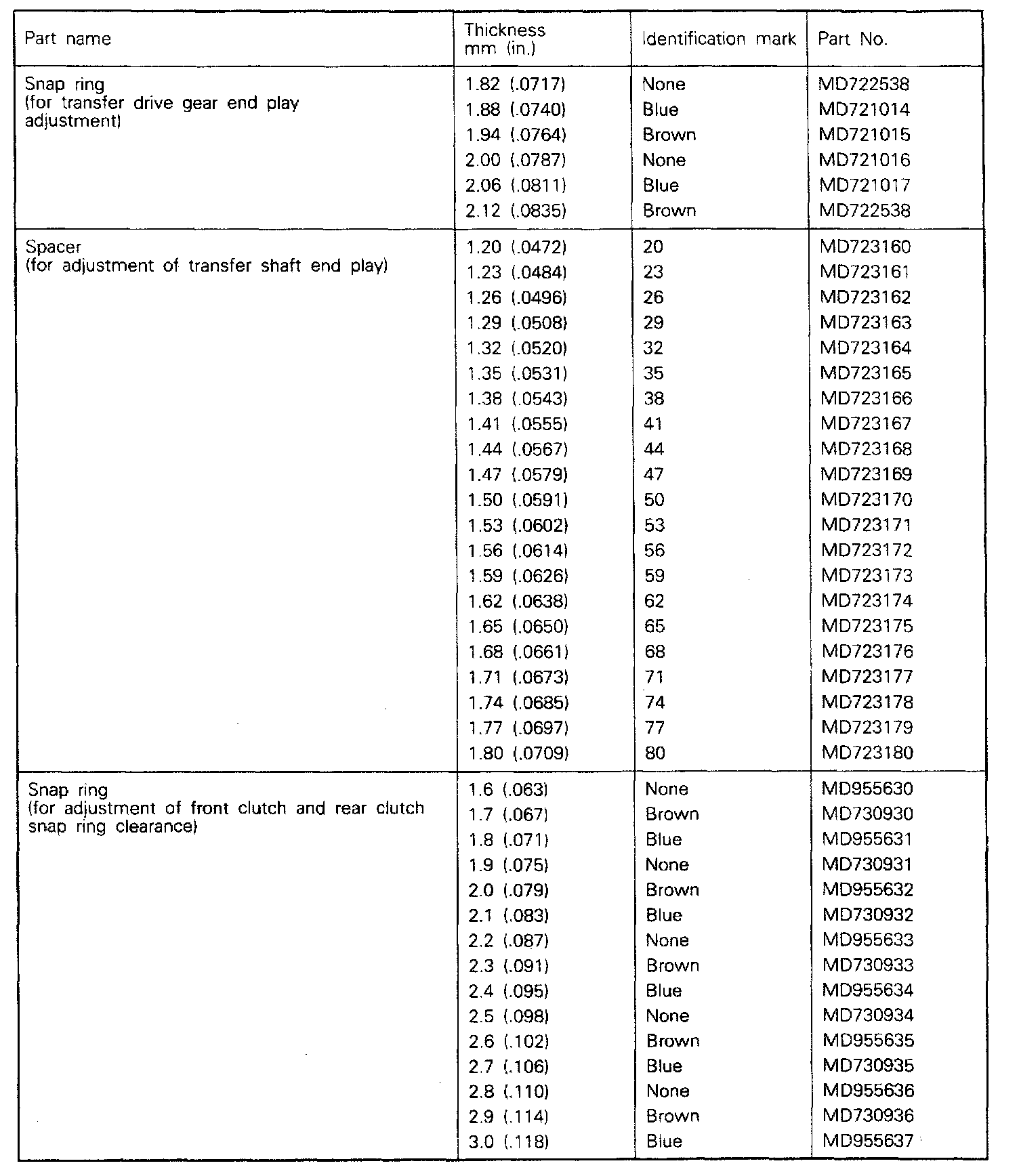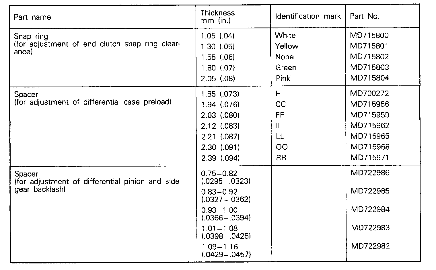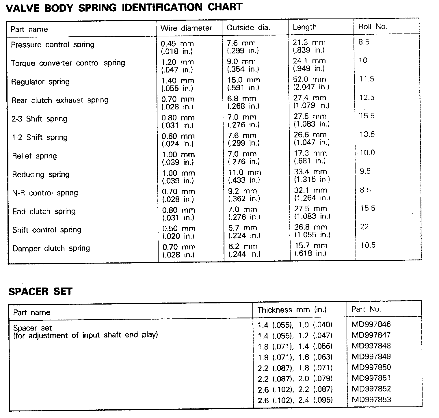 F4A22 4-spd A/T, Spring Chart & Spacer Set: